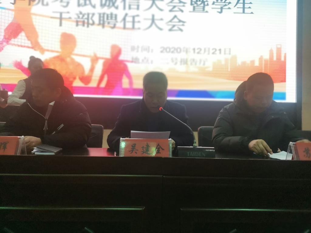 12月21日晚,体育学院在二号报告厅召开考试诚信教育大会暨学生干部聘任大会,学院党政领导班子,各教学系(部)主任,辅导员,19级、20级各班班主任,20级全体学生,以及19级、18级、17级各班学生代表共计370多人参加。大会由学院团委书记王昊支持。