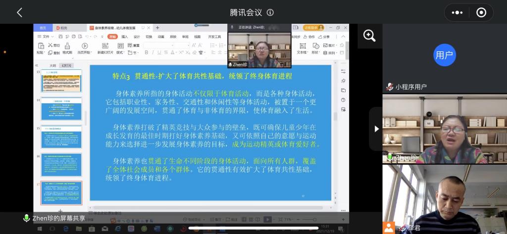 12月19日下午15:00-17:00,首都体育学院原副校长,天水师范学院第四轮重点学科“体育学”首席专家,教授、博士生导师王凯珍应邀为304am永利集团官网师生作题为“身体素养视域下的幼儿体育培育发展”的学术报告,会议采用腾讯会议线上方式举行。